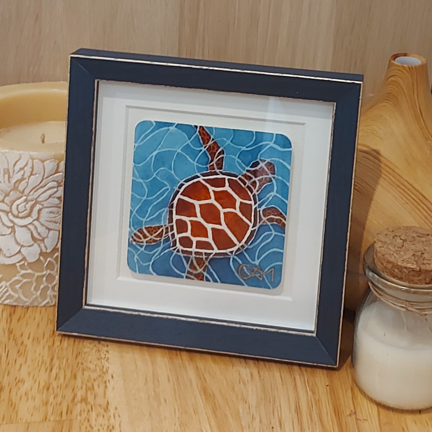 This mini artwork is of a gentle turtle gliding through the water, as a symbol of wisdom and patience. I hope it brings a sense of calm to your space.